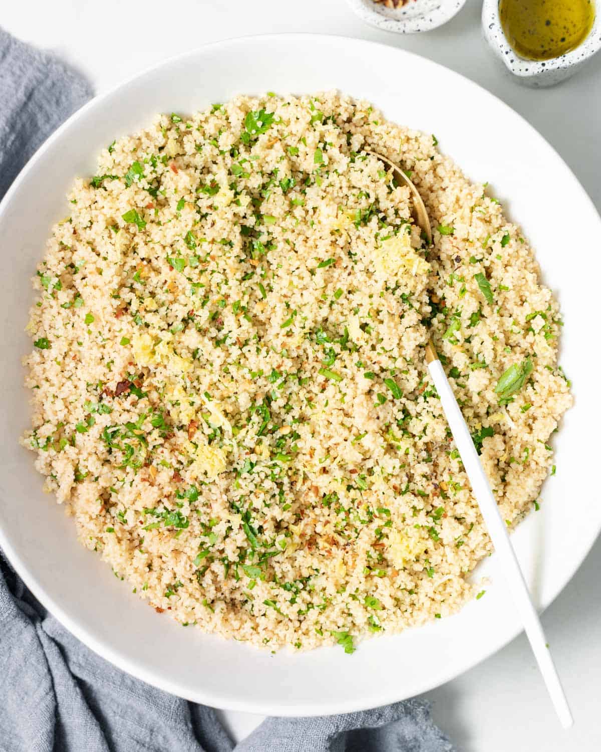 - Herbs: You can use any herbs to flavor couscous. We like the simplicity and fresh flavor of chopped parsley.