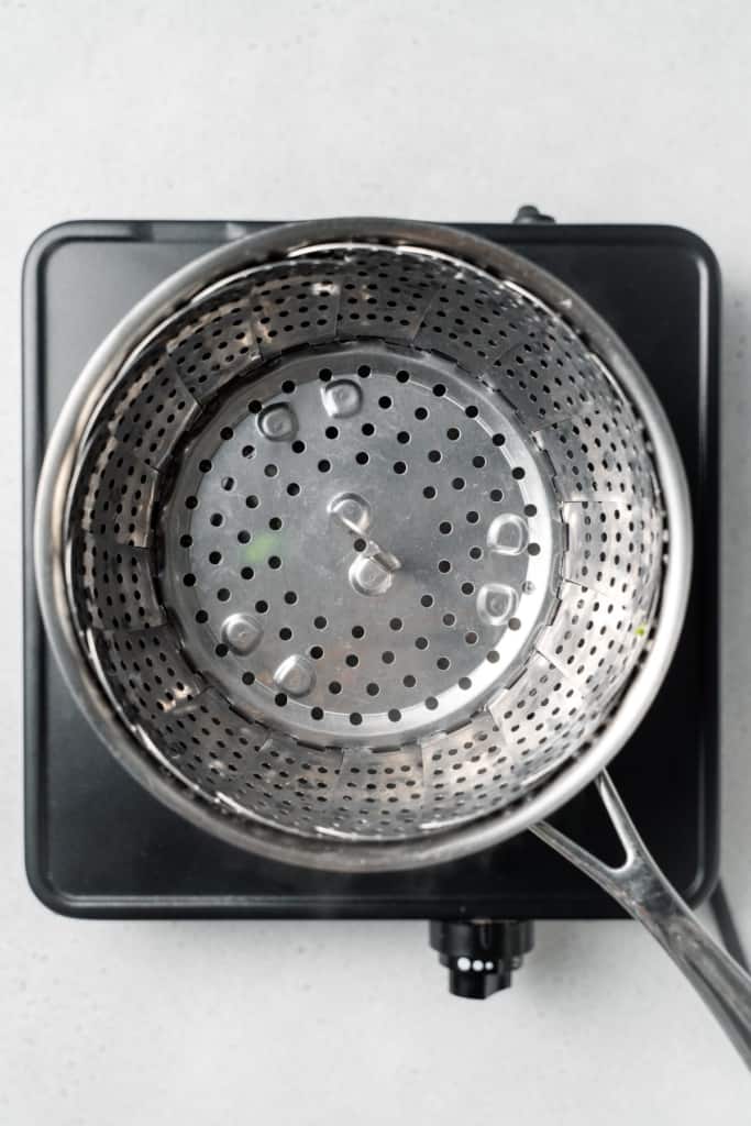 - Add the steamer basket into the pot over the layer of water. Make sure the basket does not touch the water. Add the broccoli florets onto the steamer basket and cover the pot with a lid.