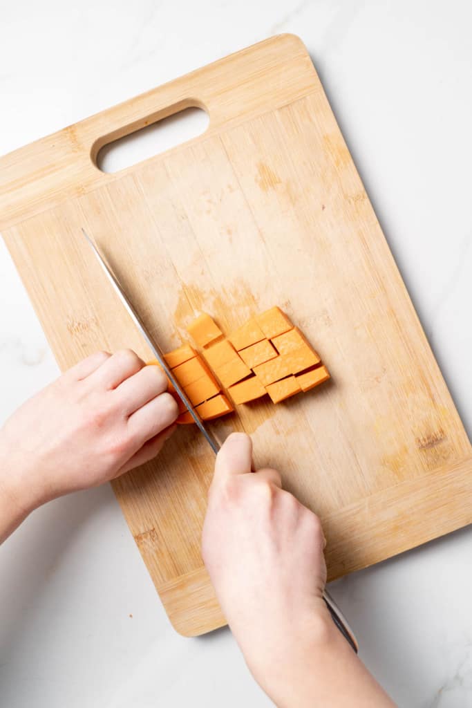 This guide will show you How to Cut Sweet Potatoes into cubes or sticks. You can use these easy knife skills to prep sweet potatoes for making fries, roast for a side dish, and use them in so many delicious recipes!
