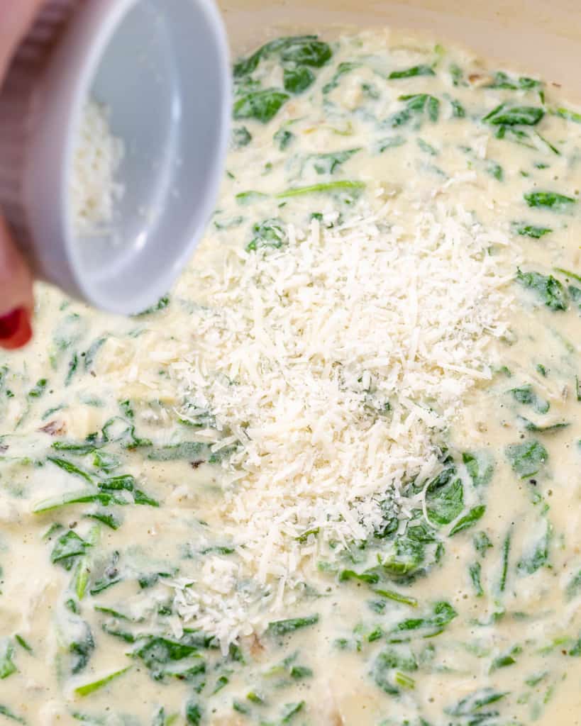 Reduce the heat and allow the sauce to simmer for about 3-5 minutes, or until it thickens. Stir in the baby spinach and cook for 2 minutes, just until wilted. Stir in the parmesan cheese and allow the sauce to simmer until the cheese is melted.