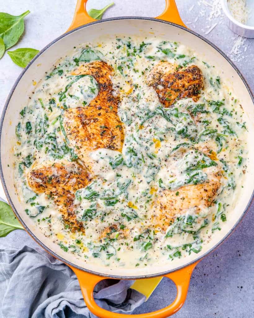 A low-carb Creamy chicken spinach recipe that’s easy to make and ready in just 30 minutes. Tender and juicy chicken breasts nestled in a creamy parmesan spinach sauce that’s so delicious it will become a weeknight favorite.