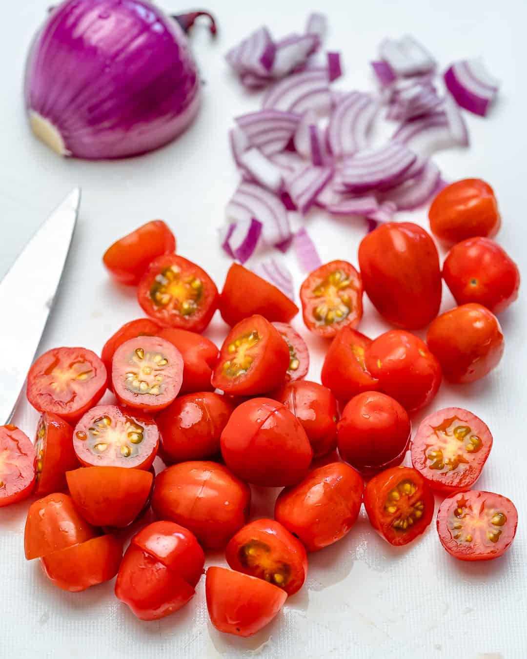 • Tomatoes: Use Cherry tomatoes if possible, because they tend to be sweet and crispy. Of course, you may chop up any other tomatoes you have but try to stick to grapevine tomatoes