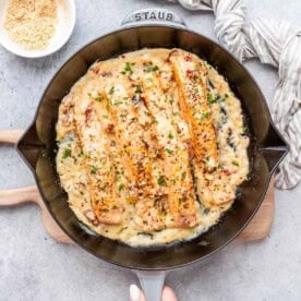 I’m not sure I mentioned this before, but I have a picky eater that won’t touch salmon or any seafood. I usually have pre-packed single-serve chicken breasts that I take out and sear on the side for her whenever I make this marry-me salmon. I serve hers with the same sauce as the salmon, and the problem is solved, lol.