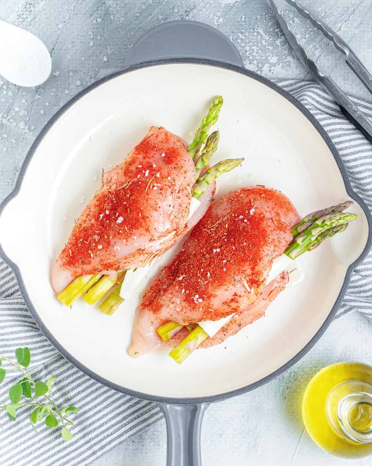 Chicken breasts are seasoned with garlic powder, paprika, and Italian seasoning mix. Stuffed with asparagus, cheese, and sundried tomatoes, they are seared to get a golden hue and then baked to perfection.