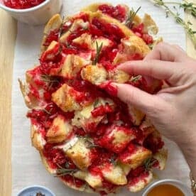 As soon as cranberry is in season I get excited to make all thing cranberry especially this cranberry pull apart bread recipe that I make with sourdough bread, cranberry sauce, and brie cheese. My kids love it with a drizzle of honey over it and I thought it would be a nice optional for those who like a touch of sweetness. I usually use my cranberry orange sauce recipe to make it, but you can certainly use store-bought cranberry sauce.