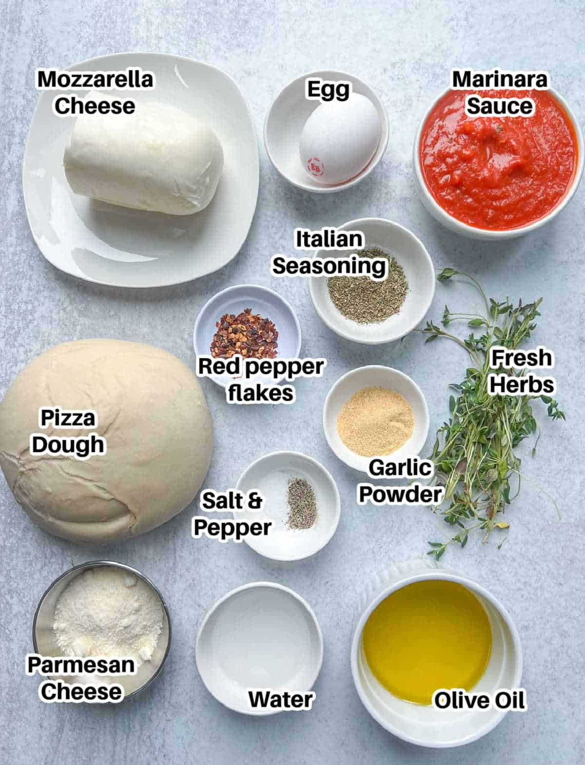The ingredients are pretty simple. Even though I used frozen pizza dough to make it, you can either make your own or simply get the Pillsbury pizza dough which is not the best option especially if you can make your dough from scratch or buy premade dough that’s frozen and simply thaw it ahead.