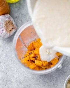 Step 2: Meanwhile, boil the pasta in salted water according to package directions to al dente. Drain and set aside. To make the sauce, heat the oil in a small saucepan over medium heat. Sauté the garlic for 30 seconds, then stir in the flour. Add the milk little by little and continuously whisk until no visible lumps. Allow the sauce to bubble for around 5 minutes to thicken. Stir in the cheese and whisk until incorporated. At this point, the sauce should be thickened to coat the back of your spoon. Don’t worry if it’s not smooth, it will be perfect after blending. Transfer the sauce to a blender and add half of the roasted butternut squash. Blend until smooth.