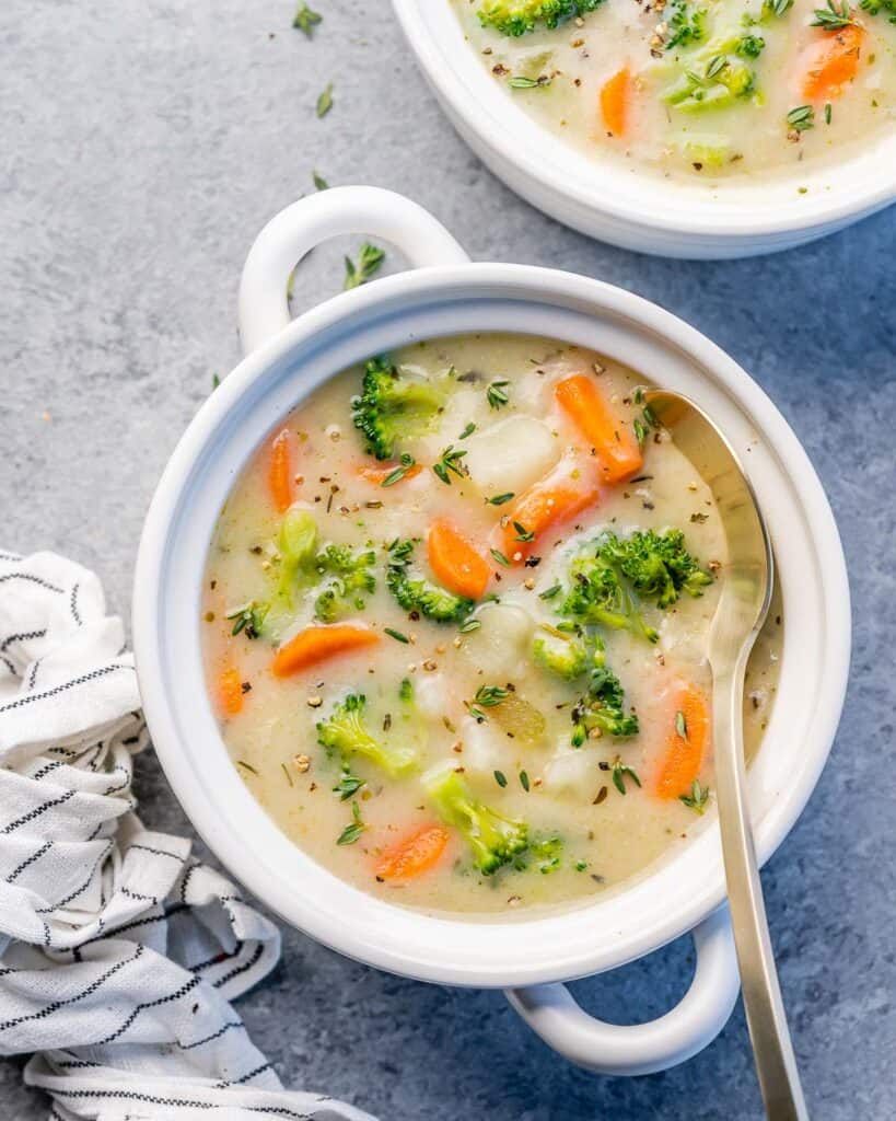 Creamy Vegetable Soup will truly warm your soul. It’s perfectly thick and rich with wonderful savory flavor from all of the vegetable goodness and the cream broth. For the thickness, we’re skipping the heavy cream and even the flour, and instead using a mixture of cornstarch and any milk you’d like.