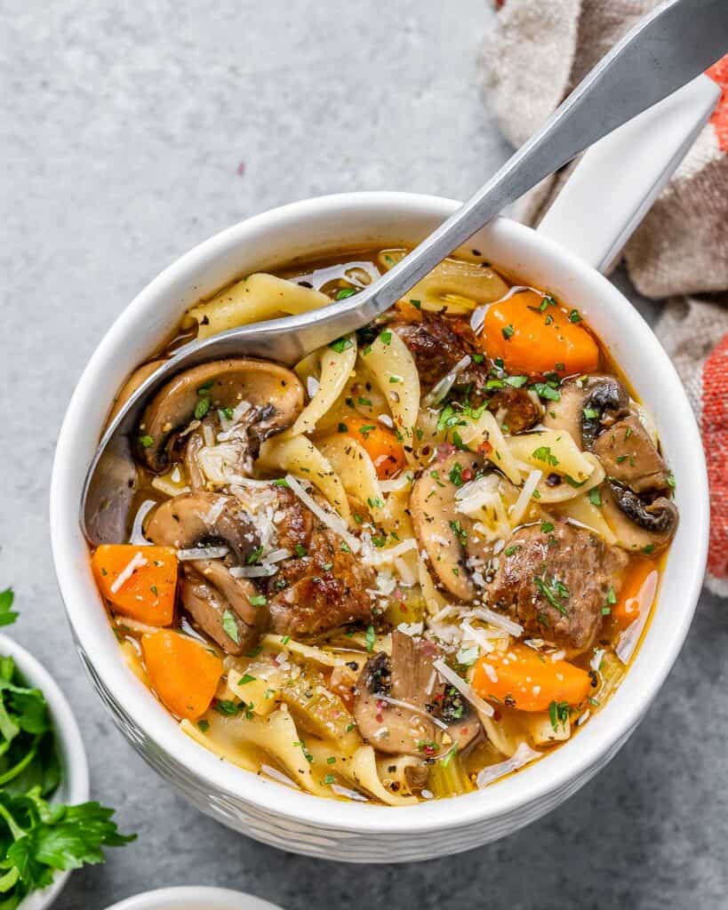 Piping Hot Beef Noodle Soup is the best comfort food! It’s a delicious combination of melt-in-your-mouth, seasoned pieces of beef in a savory broth with soft noodles that soak up all of the incredible flavors. To make this extra satisfying, we’re adding mushrooms, onion, carrots, and celery. This nourishing soup recipe is easy to make and will keep you warm when it’s chilly outside!